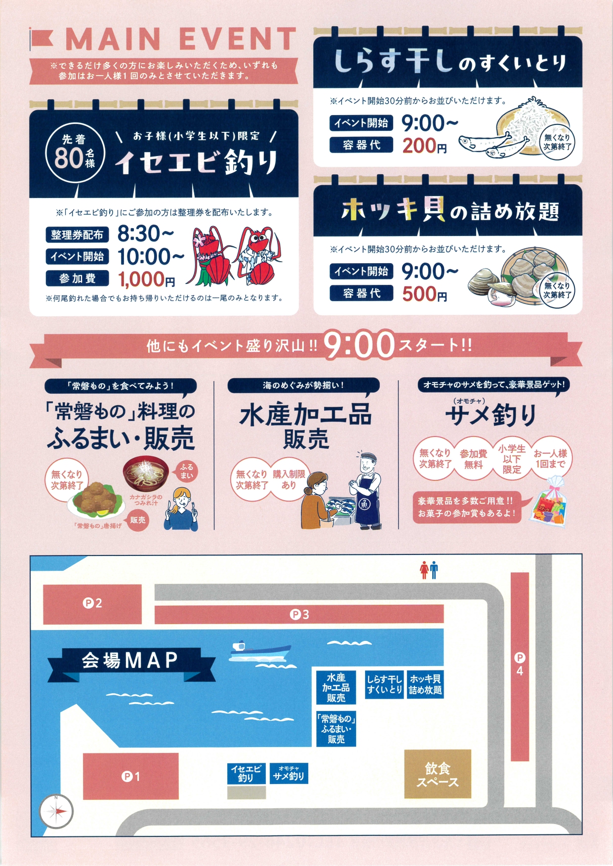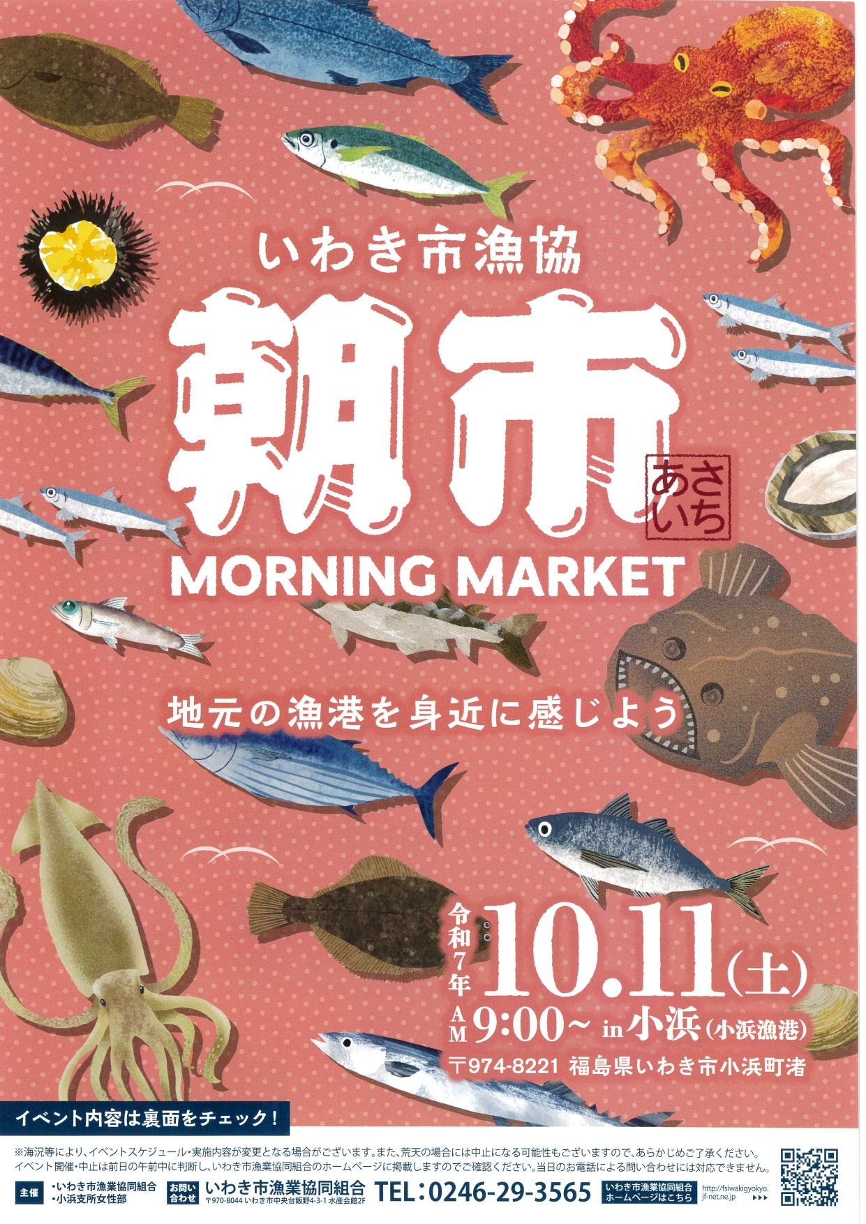 小浜漁港で「朝市」が開催されます! 2025年10月03日 イベント・お知らせ, お知らせ 10月11日(土)、小浜漁港にて「朝市」が開催されます! 朝市では「イセエビ釣り(※小学生以下限定)」や「しらす干しのすくいとり」、「ホッキ貝の詰め放題」、「常磐もの」料理の販売やふるまいが行われます! イセエビ釣りやしらす干しのすくいとり、ホッキ貝の詰め放題、ふるまい等は、先着順となっており、無くなり次第終了になりますのでご注意ください! ※詳しくはチラシをご覧ください。 tweet