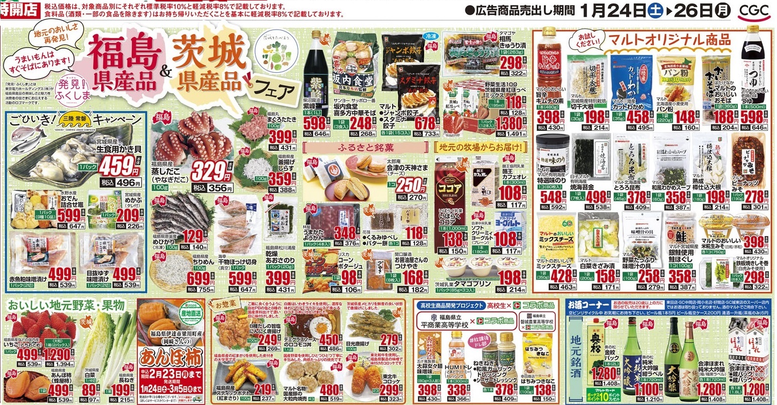 発見!ふくしま 福島県産品&茨城県産品フェア 2026年01月23日 イベント・お知らせ, お知らせ 令和8年1月24日(土)~26日(月)、いわき市内のスーパーマルトにて 福島県産品&茨城県産品フェアを開催します! 今回は、小名浜海星高校の実習船「福島丸」のマグロに加え、茹でダコや、釜揚げしらすにちりめん、水産加工業者「海幸」のほっけ切り身の干物などが販売されます! この機会にぜひ、「常磐もの」をご賞味ください! イベント:発見!ふくしま 福島県産品&茨城県産品フェア 開催日:令和8年1月24日(土)~26日(月) tweet