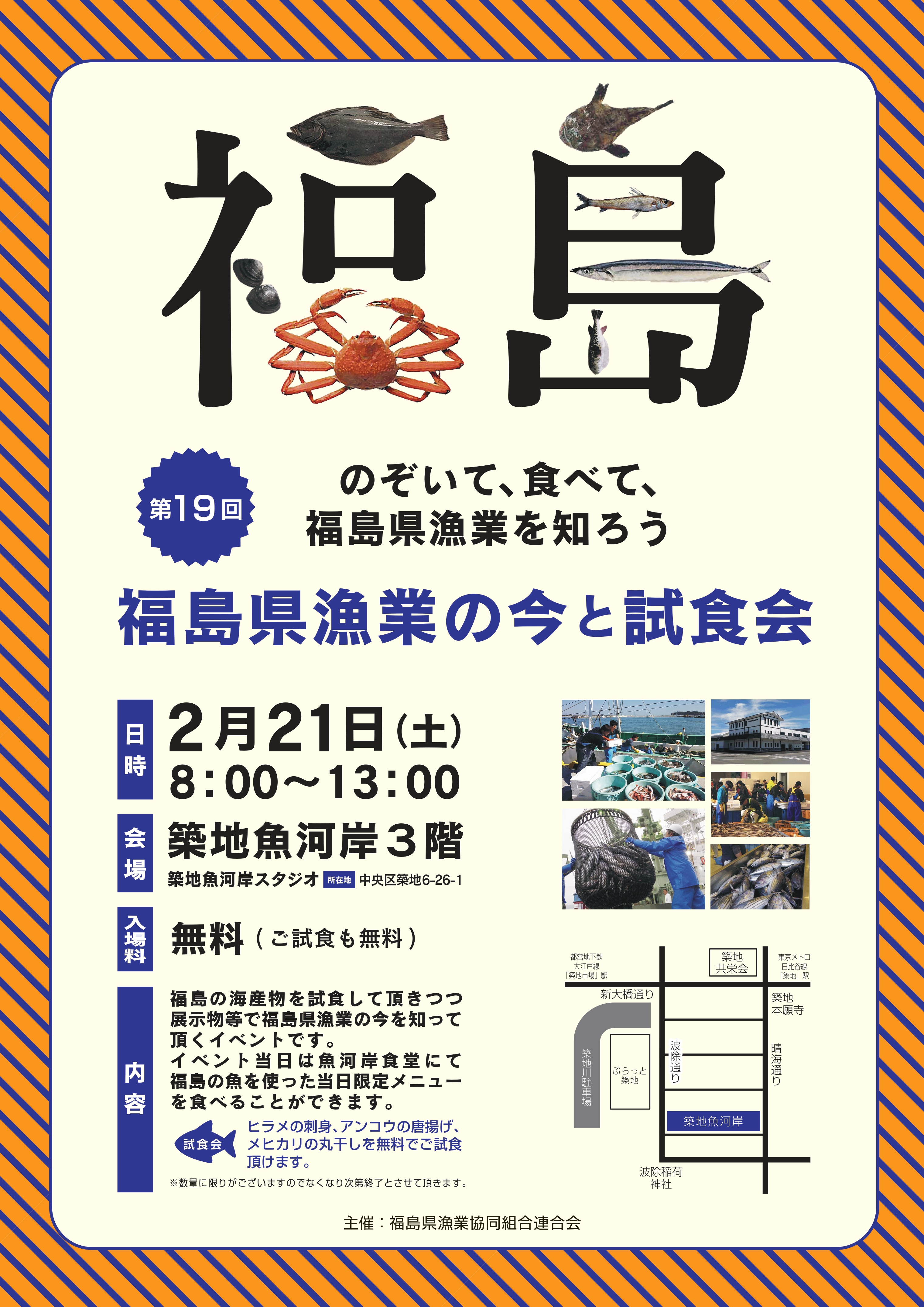 「第19回福島県漁業の今と試食会」が開催されます! 2026年02月19日 イベント・お知らせ, お知らせ 2月21日(土)午前8時から、築地魚河岸(東京都中央区)で 「第19回福島県漁業の今と試食会」が開催されます! 福島県産の魚の安全性を紹介するパネル展示のほか、 福島県で水揚げされたヒラメ、アンコウ、メヒカリを使った料理が無料で振る舞われます。 福島の水産物の安心・安全、そして「美味しい!」を感じられるイベントです。 是非、皆様足をお運びください。 ※試食品は約1,000食分用意しておりますが、なくなり次第終了となりますのでお早めにお越しください。 詳しくはチラシをご覧ください。 tweet