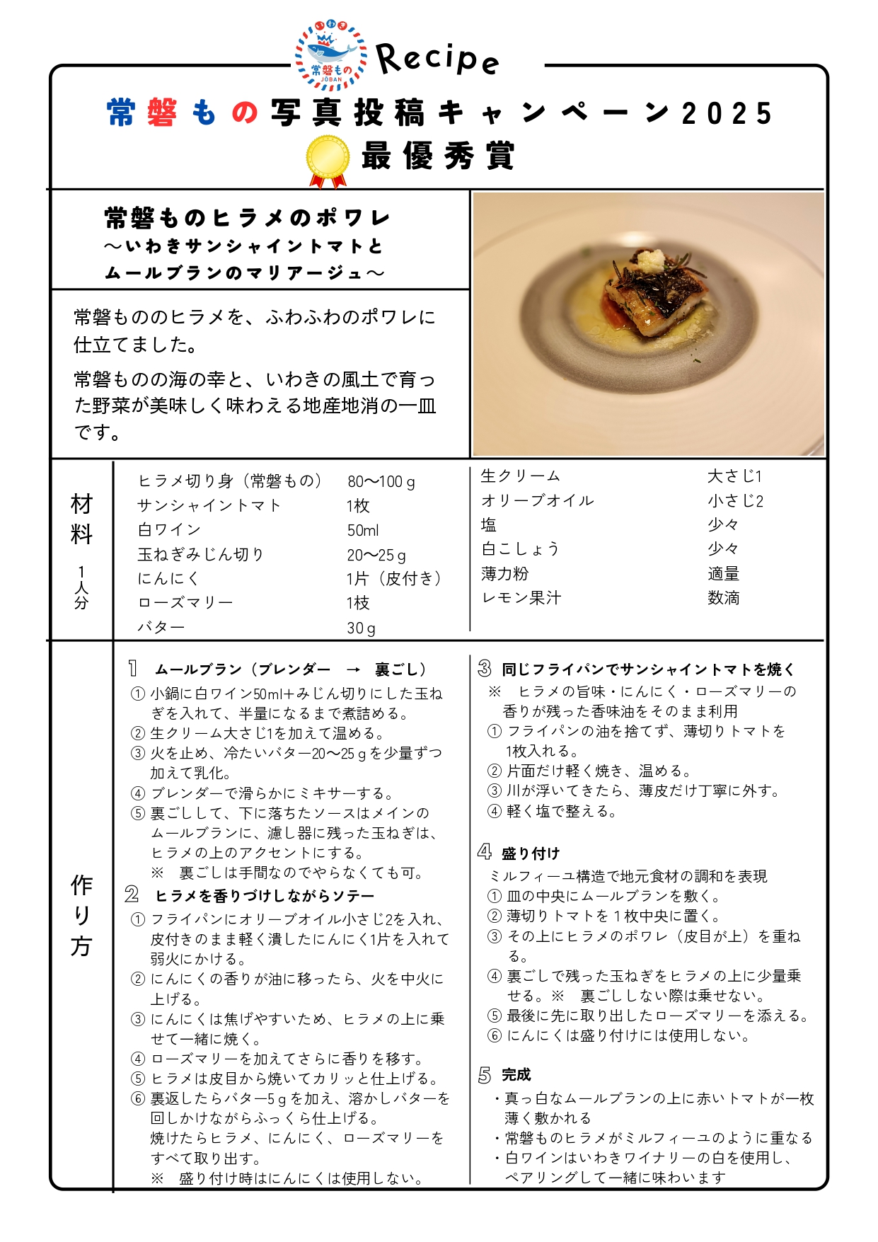 (作品名)常磐ものヒラメのポワレ ~いわきサンシャイントマトとムールブランのマリアージュ~ |